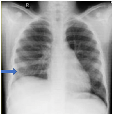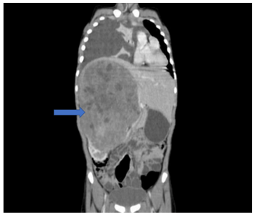 Upon initial physical examination, she had tachycardia (HR-130/min), tachypnea (RR-40/min), a normal blood pressure (110/80mmHg) and was maintaining SpO2 in the room air. Respiratory system examination showed tracheal deviation to the left, stony dull percussive note and absent breath sounds on the right side suggestive of right sided pleural effusion. Examination of the abdomen showed a well-defined, firm, mildly tender mass (12x14cm) palpable in right lumbar, hypochondrium, epigastric and umbilical regions. The upper border of the mass was distinctly palpable from the liver. There were no associated congenital malformations.