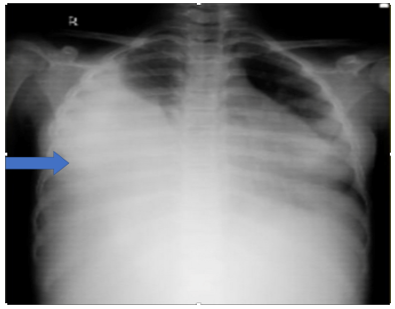 Wilms tumor is responsible for approximately 6% of all malignancies and more than 95% of renal malignancies in the pediatric age-group [1]. Early diagnosis, risk stratification, stage-based management and improved neo-adjuvant therapies have greatly improved the overall 5-year survival up to >90% [2]. Wilms tumor is most often diagnosed clinically as an incidental discovery of an asymptomatic abdominal mass by parents or attending pediatrician. Other common symptoms include abdominal pain, gross painless hematuria, constitutional symptoms, and hypertension. Rarely, fatal pulmonary embolism, hematological abnormalities and pleural effusion have been reported in children with Wilms tumor [3]. Common sites for metastasis in advanced cases include abdominal lymph nodes, lungs and less often, liver and bone. Here, we report a rare case of Wilms tumor presenting clinically with a massive pleural effusion.