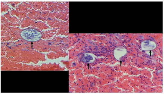Figure 4: shows high-power views of Schistosoma eggs found in different parts of the specimen, surrounded by red blood cells and infiltrates. The egg is seen to be oval-shaped, with no visible terminal or lateral spine on its shell. This appearance is consistent with Schistosoma japonicum species, the only Schistosoma species found in the Philippines.