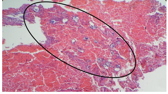 Figure 3: shows multiple parasitic ova embedded within a background of red blood cells and areas of necrosis and fibrosis.