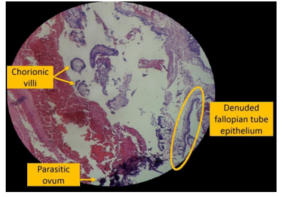 Figure 1: shows a scanner view of multiple chorionic villi, composed of the syncytiotrophoblast and cytotrophoblast, denoting the presence of pregnancy in this specimen obtained from inside the fallopian tube. Denuded epithelium of the fallopian tube, composed of simple columnar cells, are also seen. Lastly, at the lower portion of this photo is a single calcified parasitic ovum amongst red blood cells and areas of necrosis.