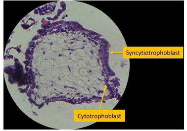 Figure 2: shows a magnified view of the chorionic villi, composed of an inner layer of cytotrophoblast and an outer layer of syncytiotrophoblast. Since this is an early first trimester placenta, it is devoid of blood vessels. The presence of chorionic villi in the specimen obtained from the fallopian tube provides evidence of pregnancy.