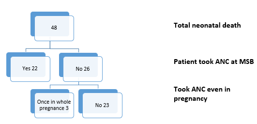 Among 48 neonatal deaths, 26 pregnant mothers did not take any antenatal checkup from our clinic but 3 patient went to the other clinic for checkup once in her whole pregnancy period. See chart-5.