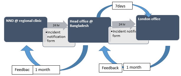 Incident Reporting system: Incident Reporting System is a sequence of systematic actions taken after a NND. Within 24 hours just after death from the center (where death has occurred) service provider/clinic manager have to notice to the head office and from head office to the London office through Incidental Notification Form about the incident. We collected (sealed) the record file/ history file just after neonatal death than we form an investigation team.