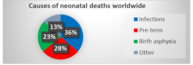 Neonatal death (NND): Death during the first 28 days of life (0-27 days). Neonatal mortality rate (NMR): Number of neonatal deaths per 1000 live births. 130 million infants born each year worldwide among them 4 million die in the first 28 days of life [2-4]. Newborn or neonatal deaths account for 45% of all deaths among children under five. Majority of all neonatal deaths (75%) occur during the first week of life and 25% to 45% occur within the first 24 hours [5]. The three major causes of neonatal deaths worldwide are: (In chart-1) [6]. • Infections which includes sepsis/pneumonia, tetanus and diarrhea (36%).• Pre-term (28%).• Birth asphyxia (23%).