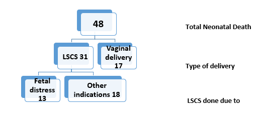 Statistics of NND at MSB in 2 year working window: Current study is based on a representative 2 year working window of MSB, June 2014 - March 2016. During this 2 year window, 52689 pregnant women took ANC (Ante-natal Care) service from the different clinics of MSB and 21,499 women gave birth in the 15 different maternity centers. Out of them 48 neonatal deaths has occurred. Chart -4.