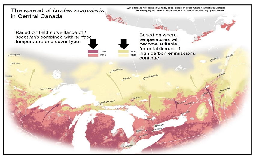 A model-based prediction by [22,23] suggested that the range of the I. scapularis tick will expand into Canada by 46 km/year over the next decades, with warming climatic temperatures as the main reason for the increased speed of spread.