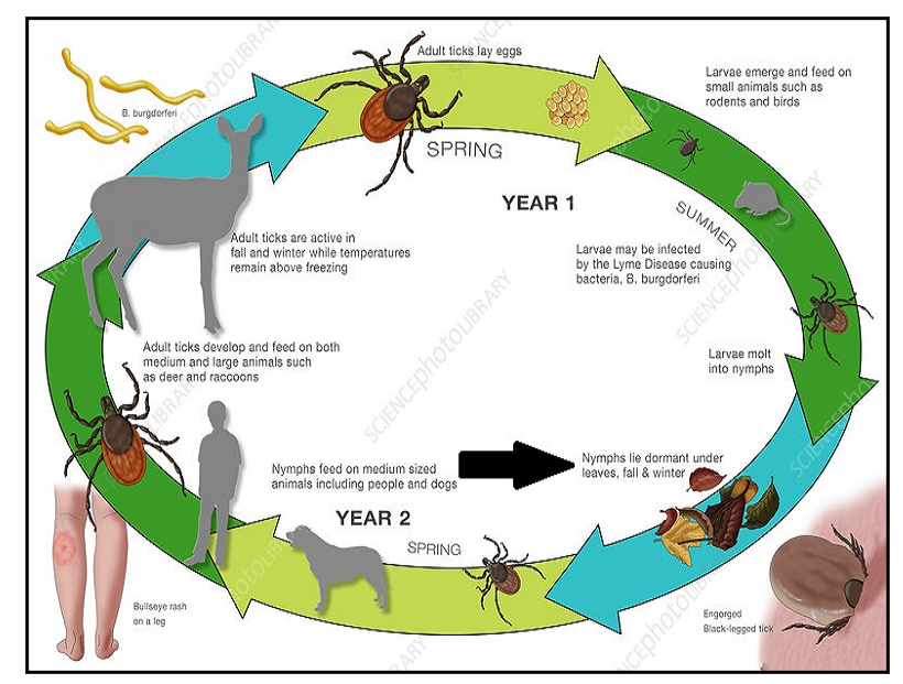 Transovarial transmission in Lyme disease complicates their epidemiology. This is where the disease agent is transferred from female ticks to her eggs so ticks immediately after emergence from the egg are infective. Larval and nymphal tick stages play important roles in maintaining the disease cycle [37].