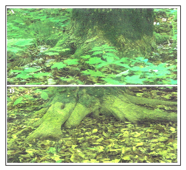 Figure 6: Forest floor and plant community at base of trees before (A) and after (B) European earthworm invasion in a sugar maple-dominated forest.